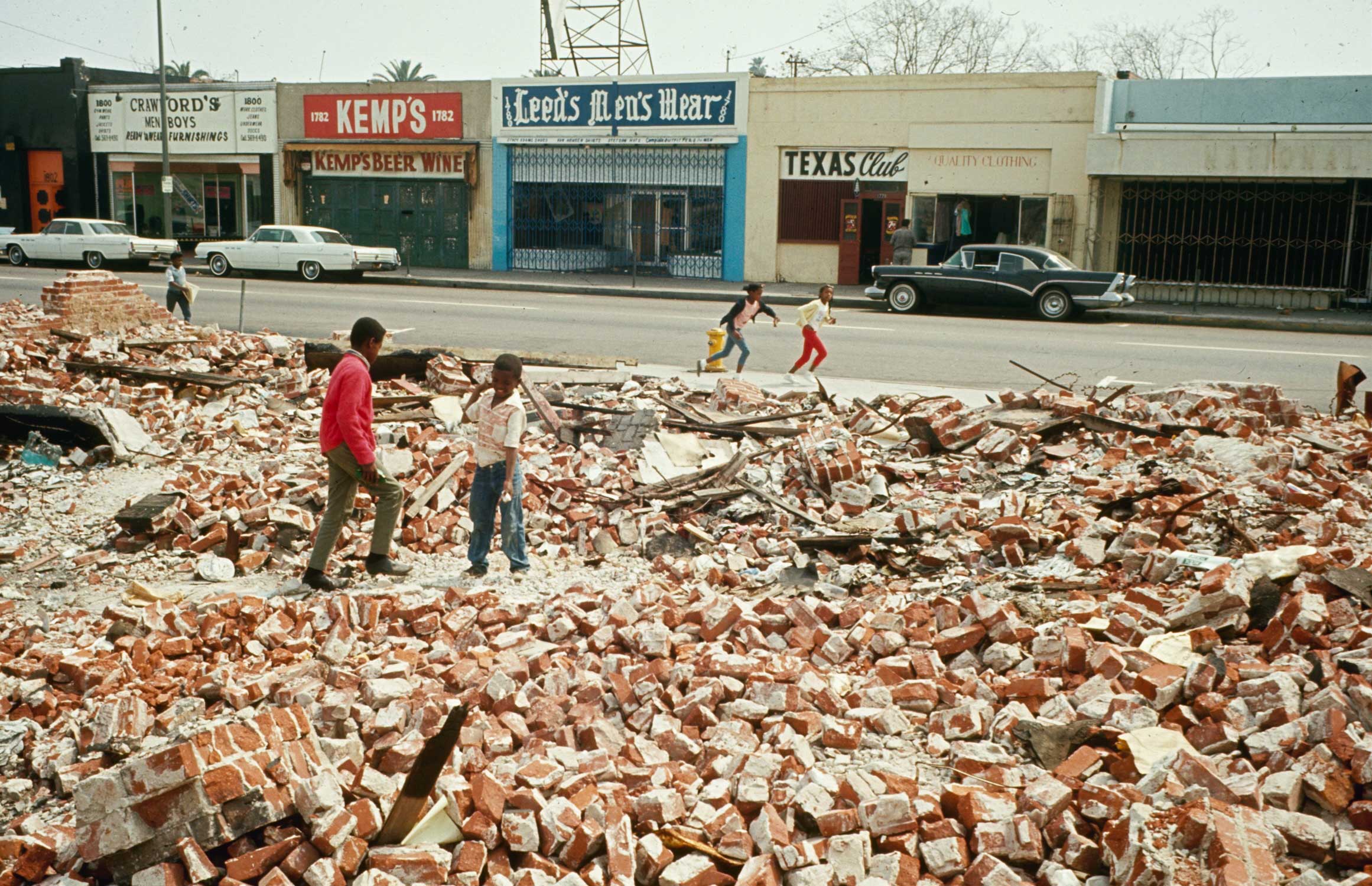 A year after the flames were put out and the smoke cleared from the southern California sky, LIFE revisited the scene of the devastation for a “special section” in its July 15, 1966, issue that the magazine called “Watts: Still Seething.” A good part of that special section featured a series of color photos made by Bill Ray on the streets of Watts: pictures of stylish, even dapper, young men making and hurling Molotov cocktails; of children at play in torched streets and rubble-strewn lots; of wary police and warier residents; of a community struggling to save itself from drugs, gangs, guns, idleness and an enduring, corrosive despair.