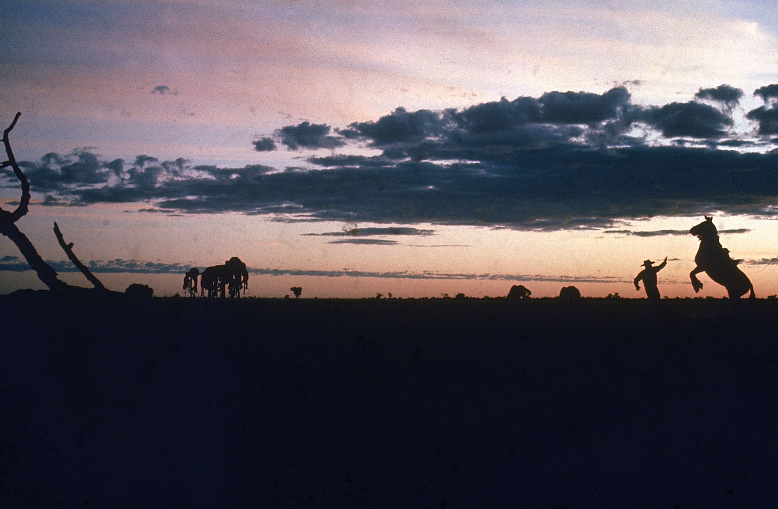 In the Australian Outback a stockman worked with one of his horses at dawn, 1966.