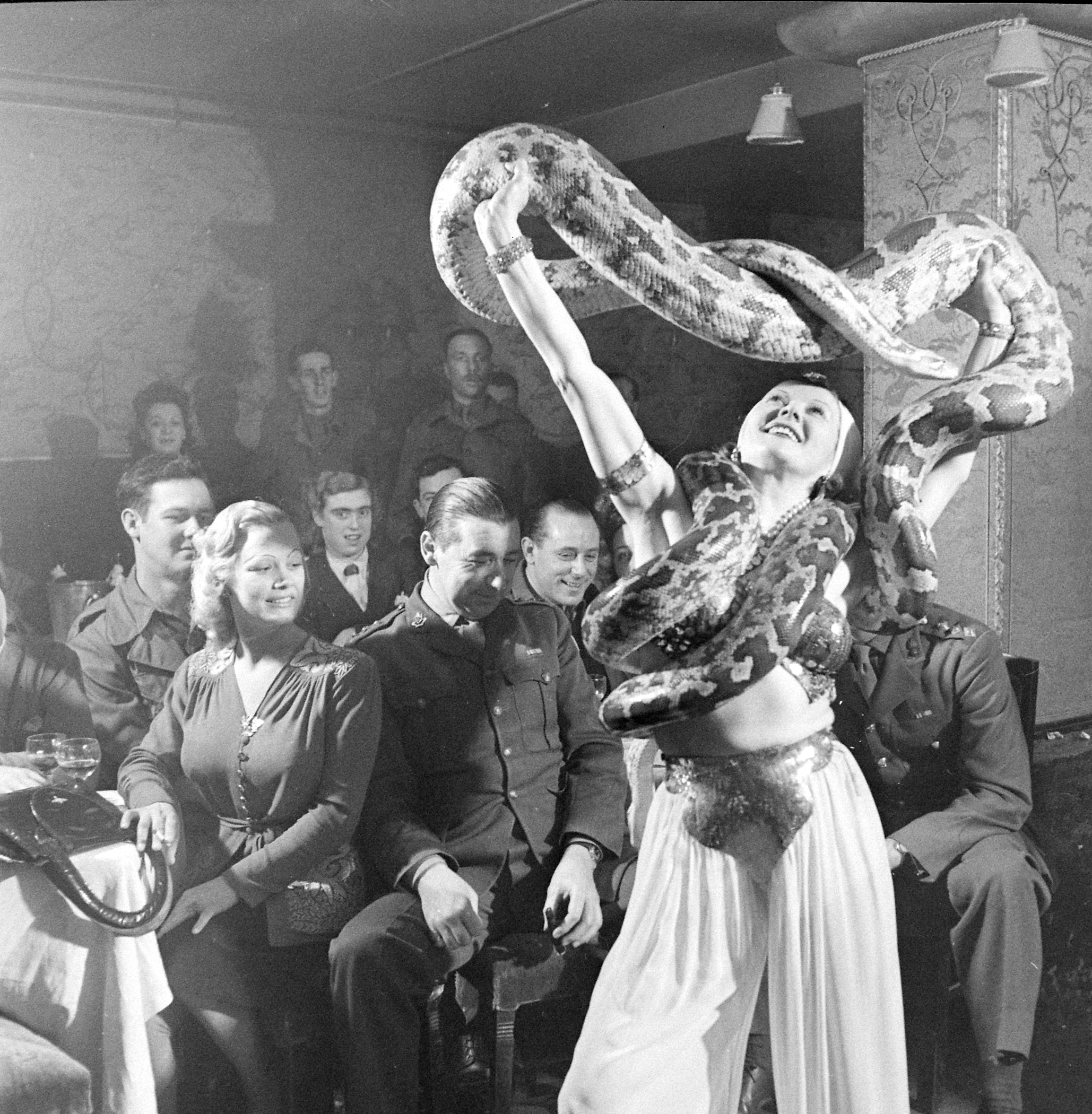 A dancer named Aicha, with two pythons wrapped around her, entertained patrons at the La Parisiana nightclub in Brussels, 1945.