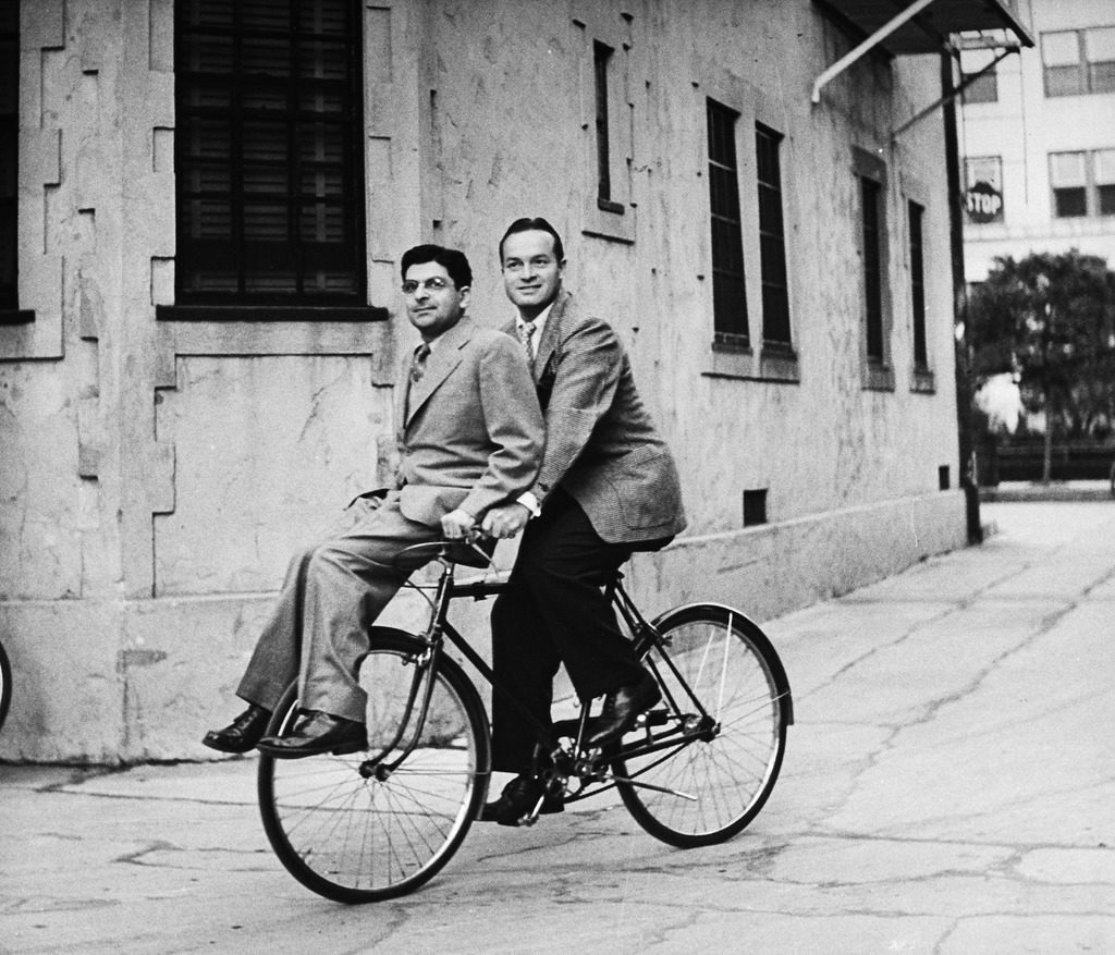 Columnist Sidney Skolsky (L) catching a ride on Bob Hope’s (R) bicycle on his way from his dressing room to the sound stage. (Photo by John Florea/The LIFE Picture Collection © Meredith Corporation)