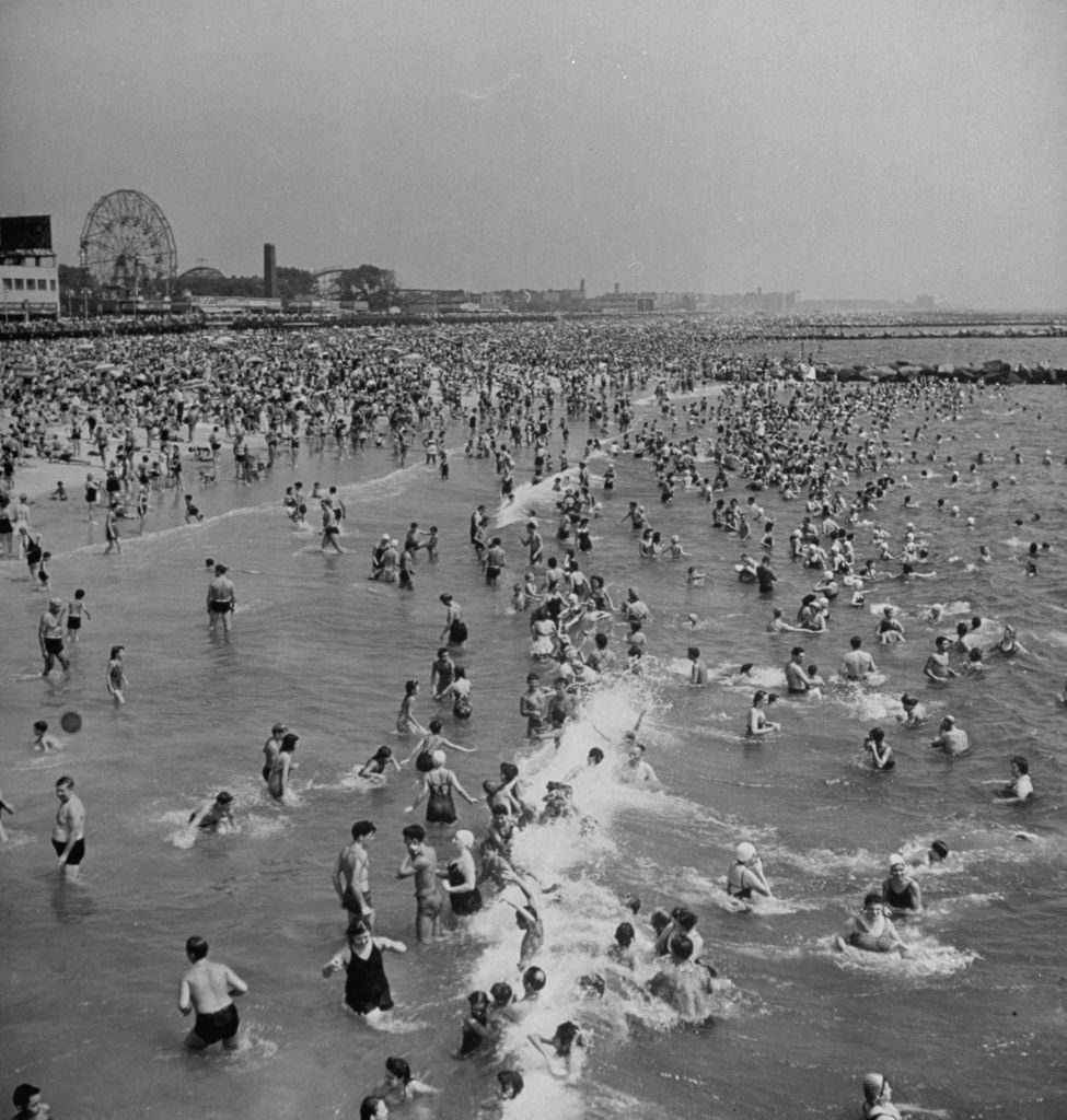 Huge crowd gathered in the surf and amp; at the beach in front of Coney Island Amusement Park. (Photo by Marie Hansen/The LIFE Picture Collection © Meredith Corporation)