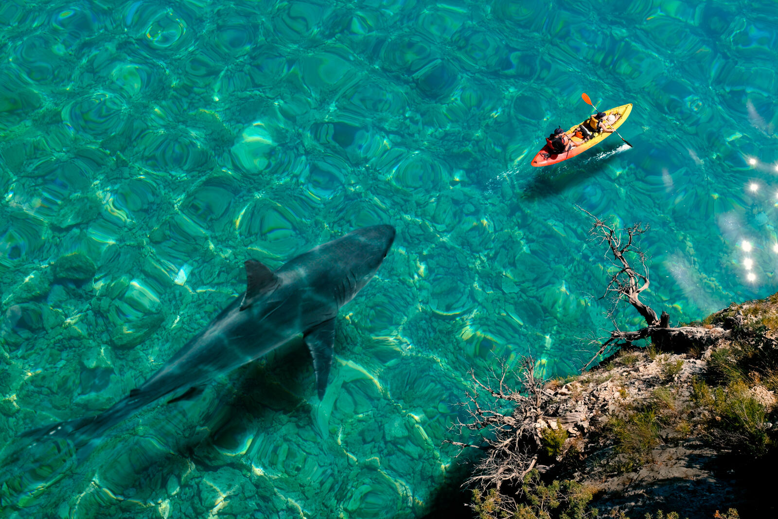 Tourists paddled a kayak, unaware of the great white shark lurking behind them.