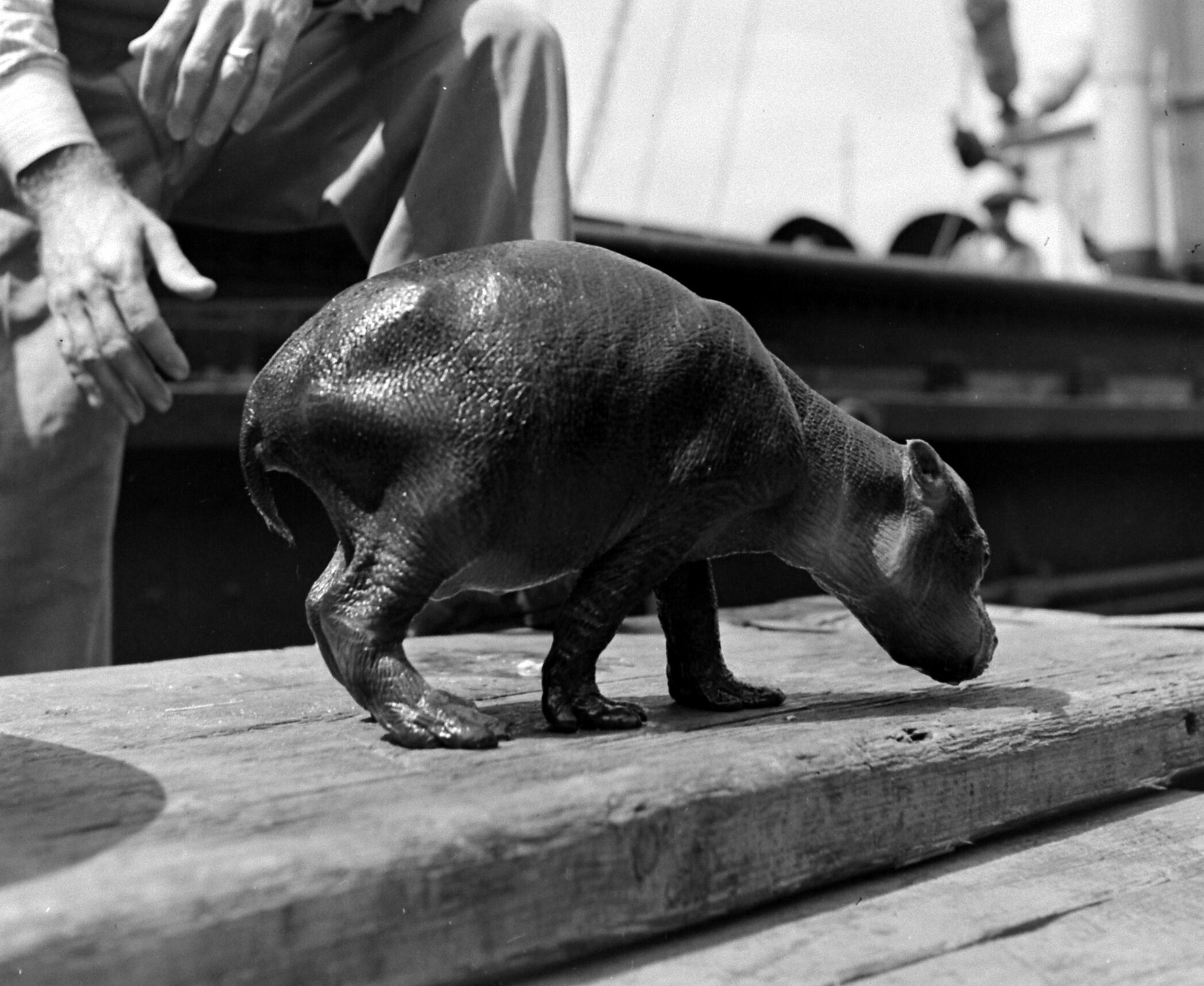 Amateur zoologist Silas E. Johnson brought this baby pygmy hippopotamus abandoned by his mother from Liberia to the U.S.; during the boatride from Africa to New York, the hippo acquired the nickname Skipper.