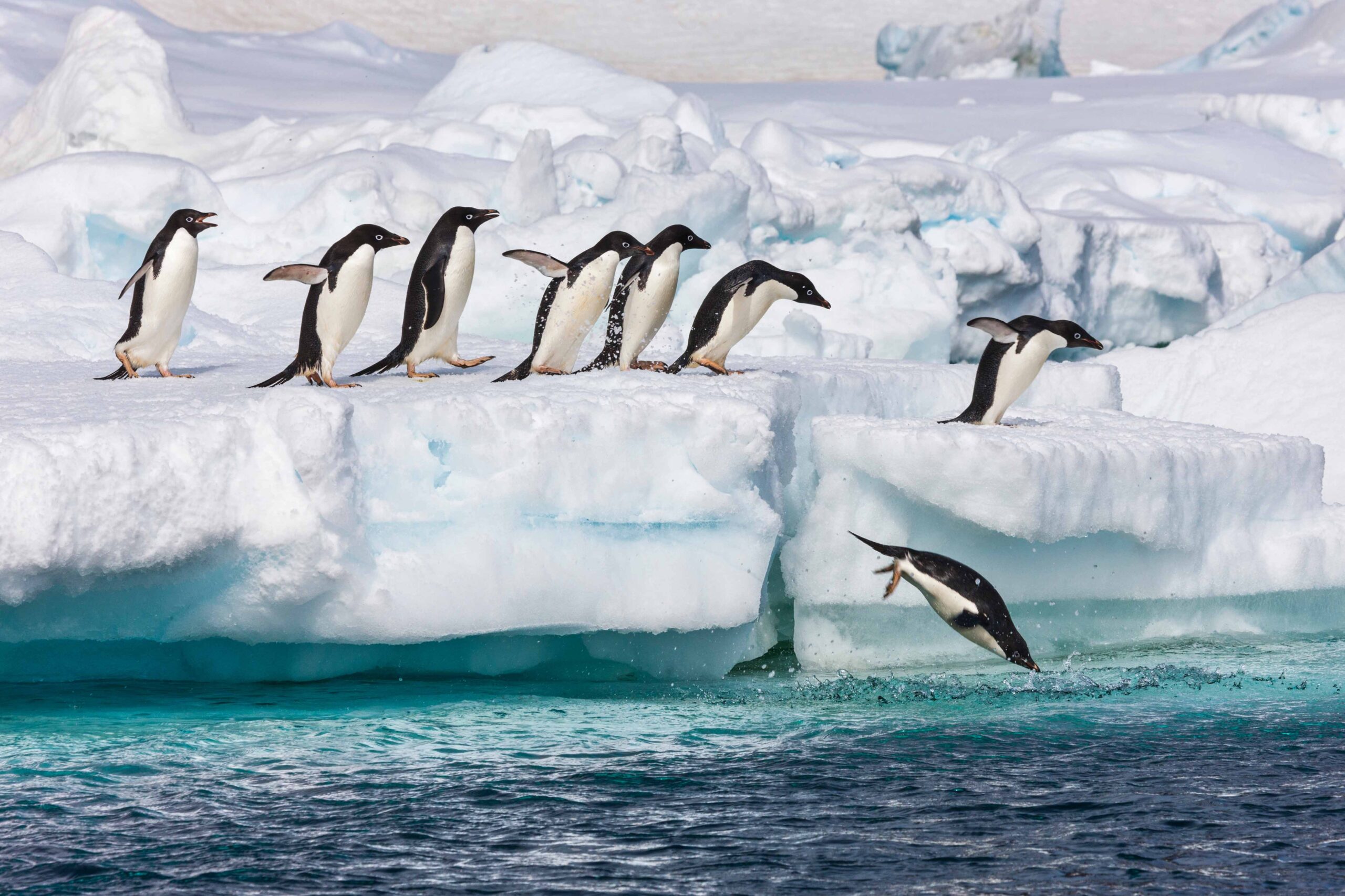 Adelie penguins leapt off a floating iceberg in Antarctica.