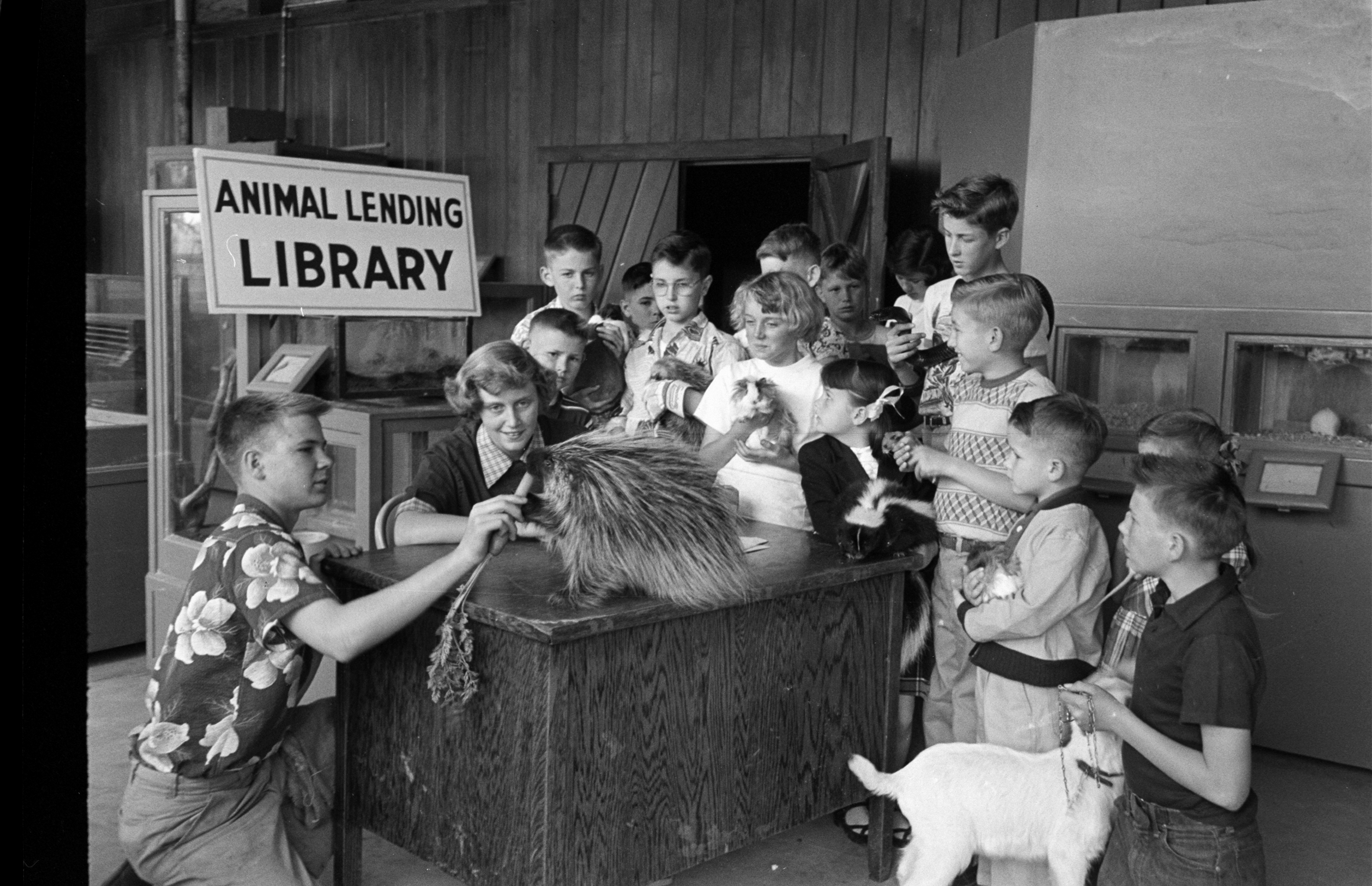 Children who visit the California Junior Museum can, if they are at least seven years old and have their parents’ permission, take home rats, rabbits, squirrels, or in special cases, a skunk or a porcupine. Designed to give children first-hand information about U.S. wildlife, the lending library has 40 animals which circulate about the rate of 20 a week….animals may be kept out for a week, and there is a ten-cent fine for overdue animals.