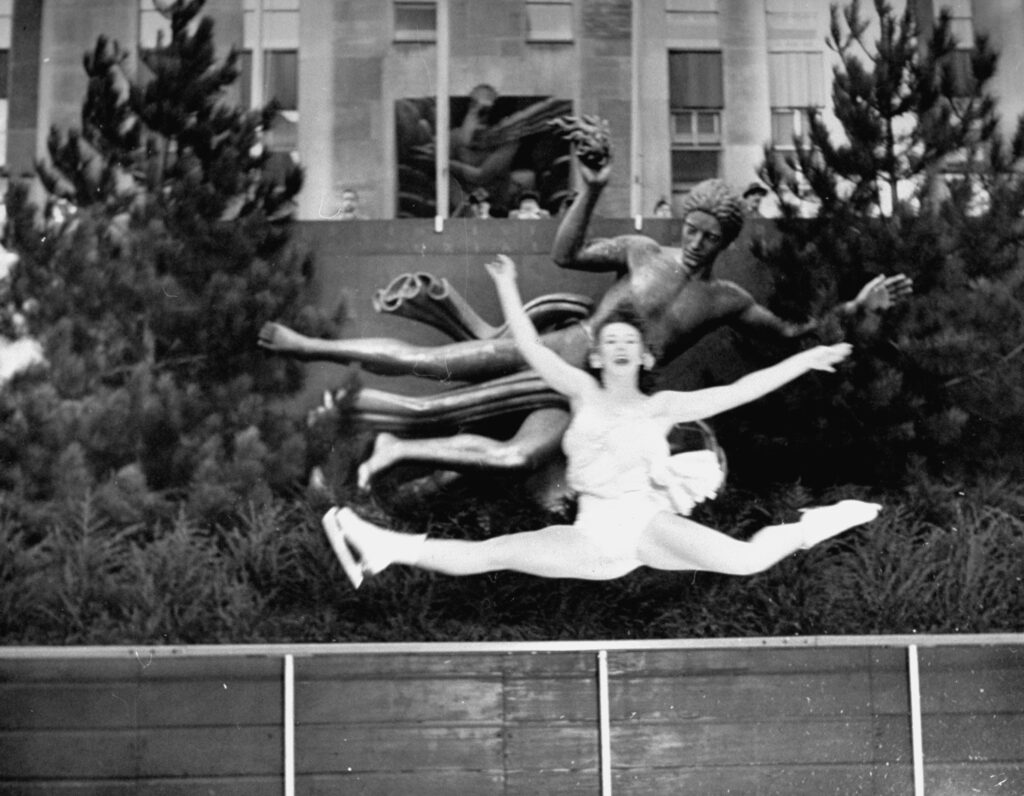 A figure skater made a leap that mimicked the statue of Prometheus at Rockefeller Center in New York, 1942.